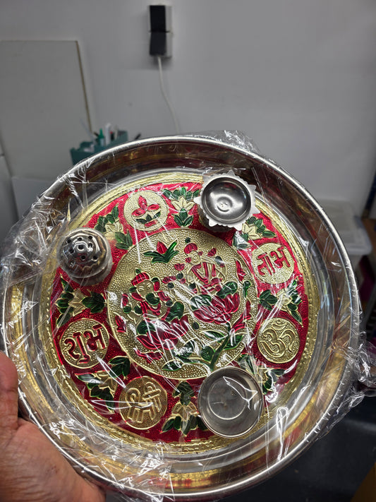 Shubh labh Pooja Thali with enamel ganapathi and laxmi stainless steel